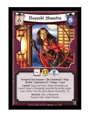 Scorpion Clan Samurai · The Underhand · Ninja · Duelist · Experienced 2 · Unique · Loyal. Limited: Target and bow a Ninja Personality you control: Target a Personality controlled by another player. Lose 4 Honor. Give the other player's Personality ?3C. Reaction: After a Maneuvers Segment ends: Assign Sunetra.
