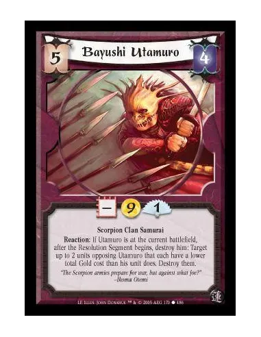 Scorpion Clan Samurai. Reaction: If Utamuro is at the current battlefield, after the Resolution Segment begins, destroy him: Target up to 2 units opposing Utamuro that each have a lower total Gold cost than his unit does. Destroy them