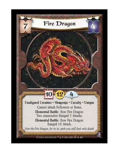 Unaligned Creature · Shugenja · Cavalry · Unique. Cannot attach Followers or Items. Elemental Battle: Bow Fire Dragon: Two consecutive Ranged 5 Attacks. Elemental Battle: Bow Fire Dragon: Ranged 10 Attack