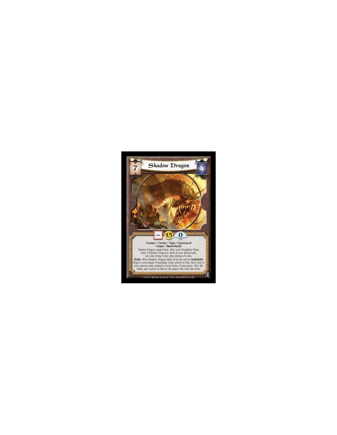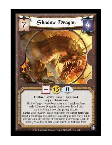 Creature · Cavalry · Ninja · Experienced · Unique · Shadowlands. Shadow Dragon cannot bow. After your Straighten Phase ends, if Shadow Dragon is dead in your discard pile, you may bring it into play, paying all costs. Battle: Move Shadow Dragon home from the current battlefield: Target a non-Unique Personality. Gain control of him. Move him to your army (instead of to your home, if necessary). After the battle, give control of him to the player this took him from.