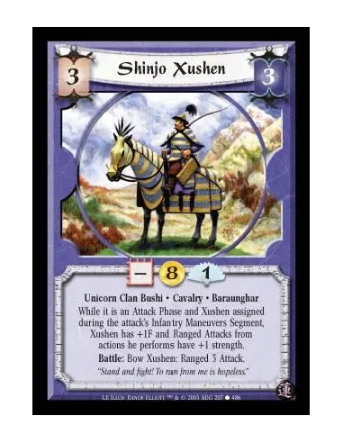 Unicorn Clan Bushi · Cavalry · Baraunghar. While it is an Attack Phase and Xushen assigned during the attack's Infantry Maneuvers Segment, Xushen has +1F and Ranged Attacks from actions he performs have +1 strength. Battle: Bow Xushen: Ranged 3 Attac