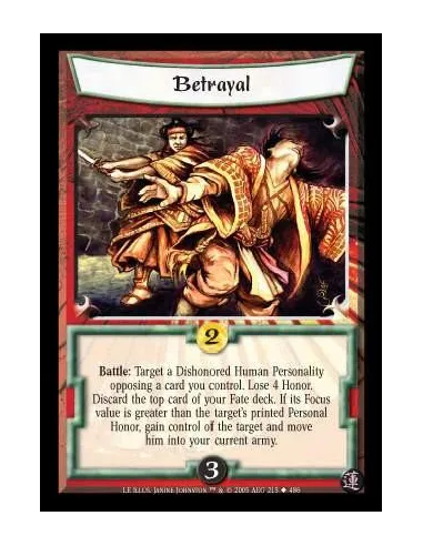 Battle: Target a Dishonored Human Personality opposing a card you control. Lose 4 Honor. Discard the top card of your Fate deck. If its Focus value is greater than the target's printed Personal Honor, gain control of the target and move him into your current army