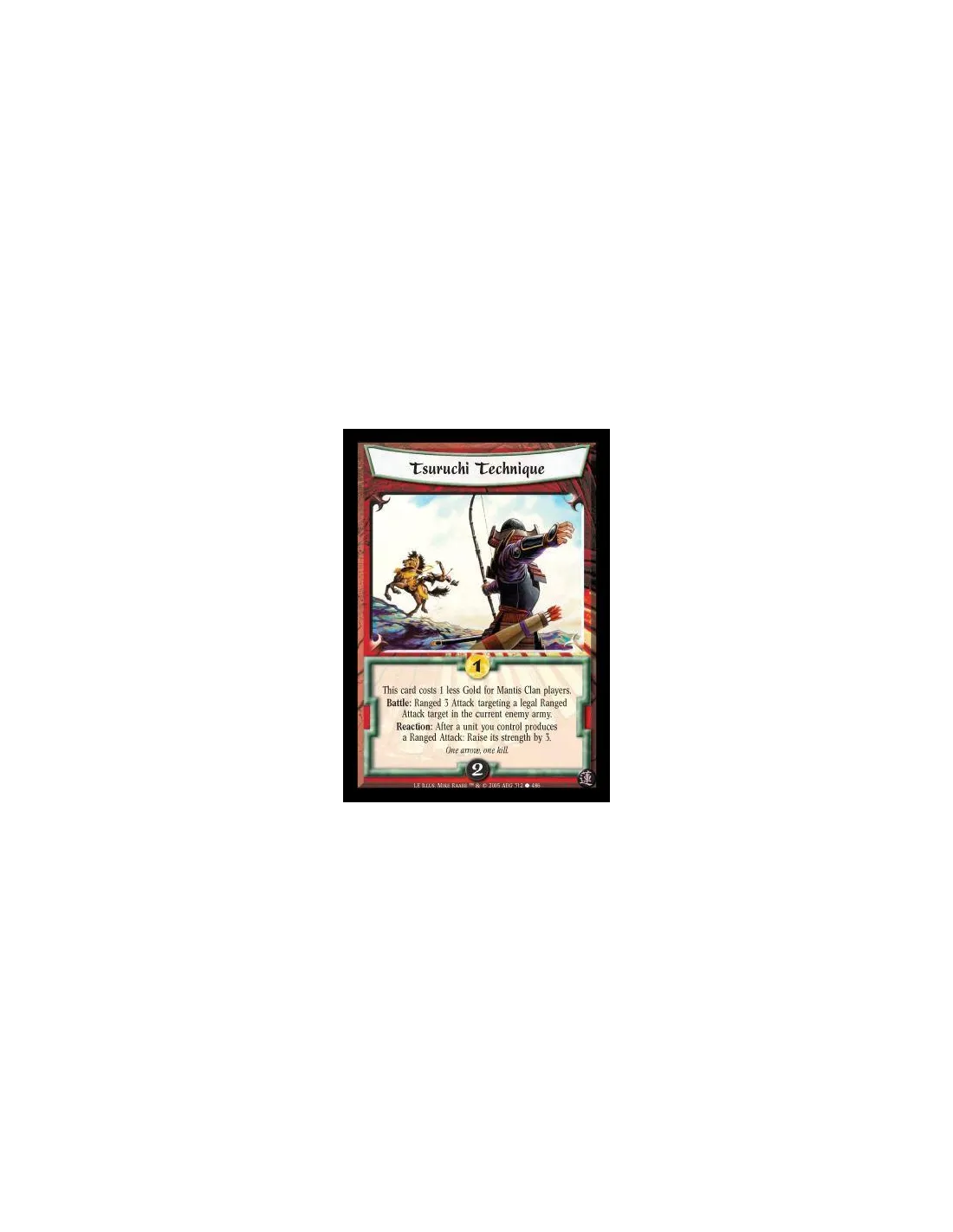 This card costs 1 less Gold for Mantis Clan players. Battle: Ranged 3 Attack targeting a legal Ranged Attack target in the current enemy army. Reaction: After a unit you control produces a Ranged Attack: Raise its strength by 3