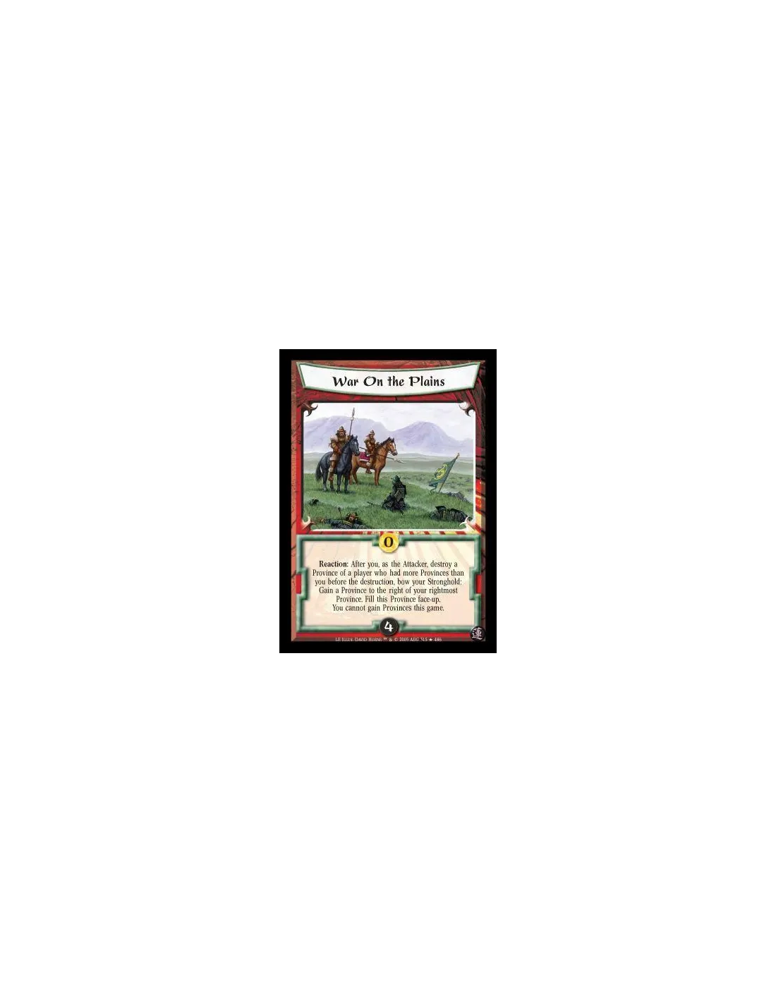 Reaction: After you, as the Attacker, destroy a Province of a player who had more Provinces than you before the destruction, bow your Stronghold: Gain a Province to the right of your rightmost Province. Fill this Province face-up. You may not gain Provinces this game.