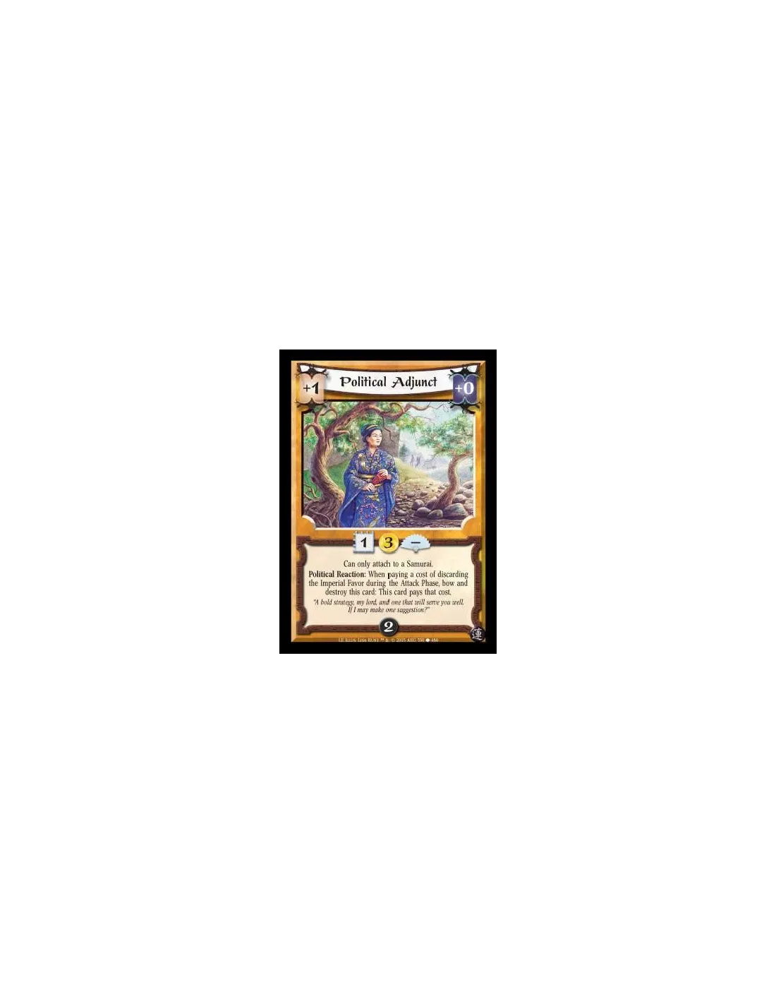 Can only attach to a Samurai. Political Reaction: When paying a cost of discarding the Imperial Favor during the Attack Phase, bow and destroy this card: This card pays that cost.