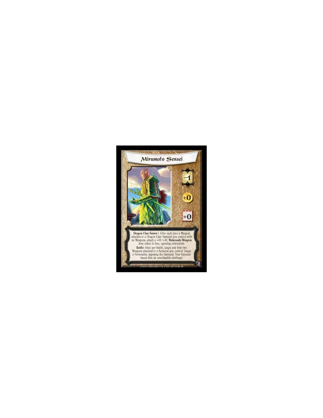 Dragon Clan Sensei. After each time a Weapon attaches to a Dragon Clan Samurai you control with no Weapons, attach a +0F/+0C Wakizashi Weapon Item token to him, ignoring restrictions. Battle: Once per battle, target and bow two Weapons attached to a Samurai you control: Target a Personality opposing the Samurai. Your Samurai issues him an unrefusable challenge