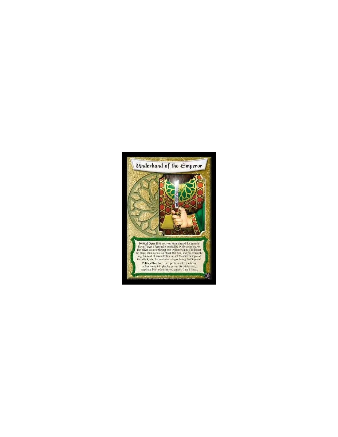 Political Open: If it's not your turn, discard the Imperial Favor: Target a Personality controlled by the active player. The player decides whether this Dishonors him. If it doesn't, the player must declare an attack this turn, and you assign the target instead of his controller in each Maneuvers Segment that attack, after his controller assigns during that Segment. Political Reaction: Once per turn, after you bring a Personality into play by paying his printed cost, target and bow a Courtier you control: Gain 1 Honor