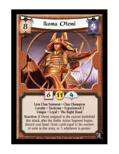 Lion Clan Samurai · Clan Champion · Cavalry · Tactician · Experienced 2 · Unique · Loyal · The Right Hand. Reaction: If Otemi assigned to the current battlefield this attack, after the Battle Action Segment begins, discard your hand: Draw cards equal to the number of units in this army, or 5, whichever is greater
