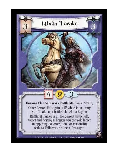 Unicorn Clan Samurai · Battle Maiden · Cavalry. Other Personalities gain +1F while in an army with Tarako at a battlefield with a Region. Battle: If Tarako is at the current battlefield, target and destroy a Region you control: Target an opposing Follower, Item, or Personality with no Followers or Items. Destroy it.