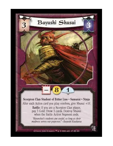 Scorpion Clan Student of Bitter Lies · Samurai · Ninja. After each Action card you play resolves, give Shusui +1F. Battle: If you are a Scorpion Clan player, pay 3 Gold: Draw 3 cards. Destroy Shusui when the Battle Action Segment ends.