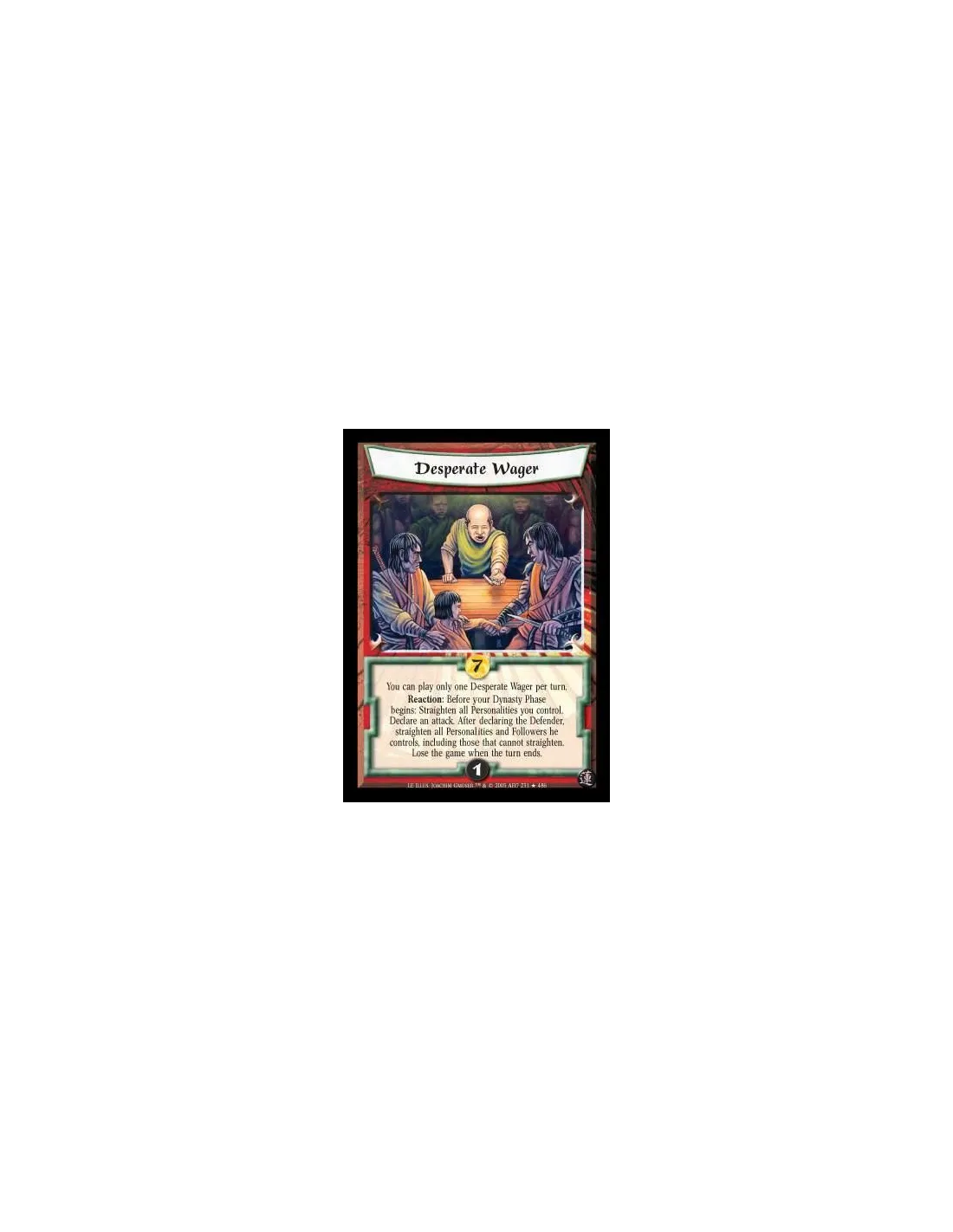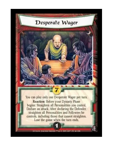 You may only play one Desperate Wager per turn. Reaction: Before your Dynasty Phase begins: Straighten all Personalities you control. Declare an attack. After declaring the Defender, straighten all Personalities and Followers he controls, including those that cannot straighten. Lose the game when the turn ends.