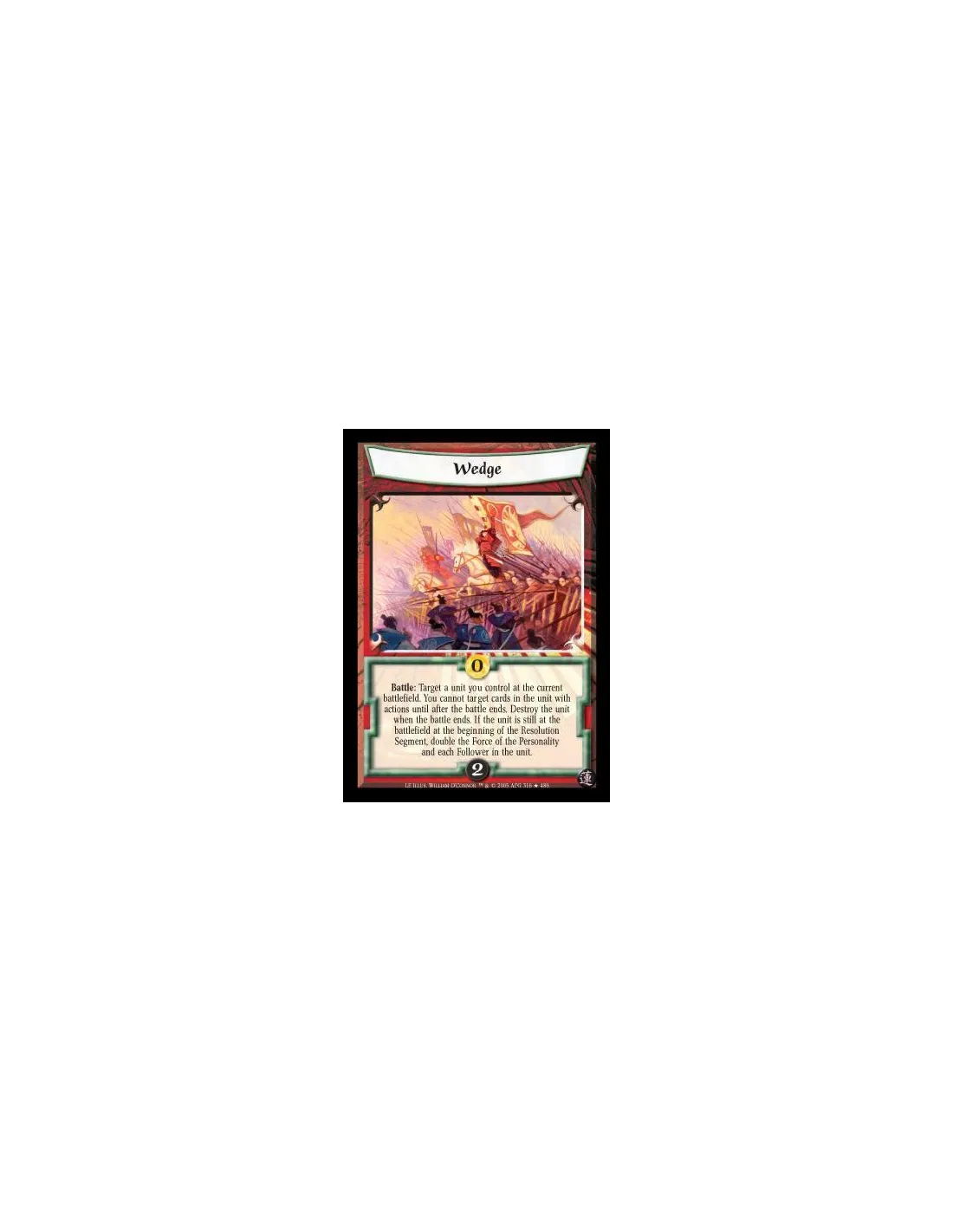 Battle: Target a unit you control at the current battlefield. You cannot target cards in the unit with actions until after the battle ends. Destroy the unit when the battle ends. If the unit is still at the battlefield at the beginning of the Resolution Segment, double the Force of the Personality and each Follower in the unit.