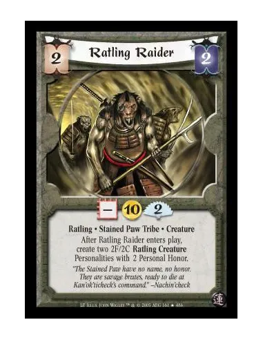 Ratling · Stained Paw Tribe · Creature. After Ratling Raider enters play, create two 2F/2C Ratling Creature Personalities with 2 Personal Honor