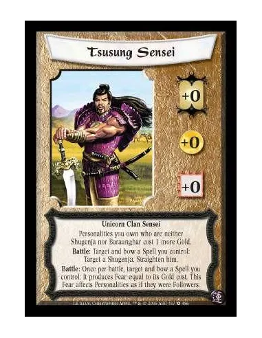 Unicorn Clan Sensei. Personalities you own who are neither Shugenja nor Baraunghar cost 1 more Gold. Battle: Target and bow a Spell you control: Target a Shugenja. Straighten him. Battle: Once per battle, target and bow a Spell you control: It produces Fear equal to its Gold cost. This Fear affects Personalities as if they were Followers