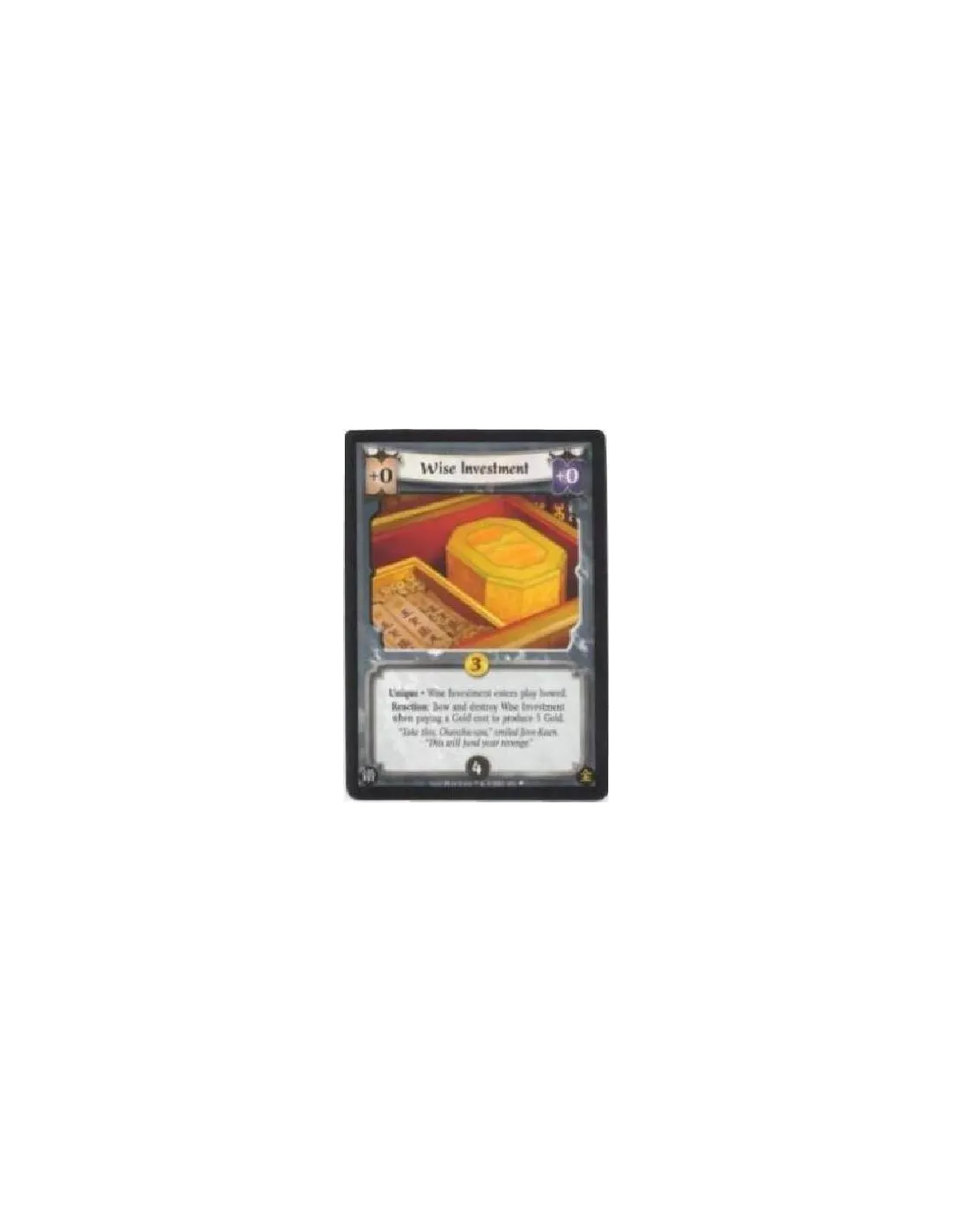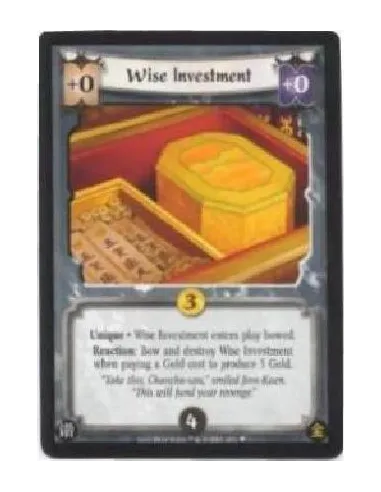 Unique Wise Investment enters play bowed.Reaction: Bow and destroy Wise Investment when paying a Gold cost to produce 5 Gold.
