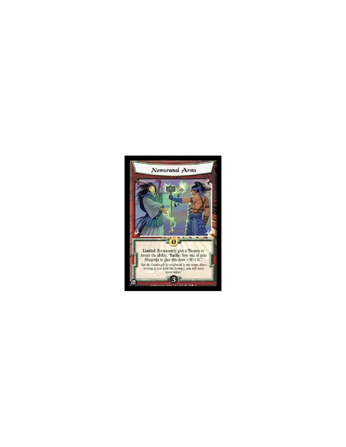 Limited: Permanently give a Weapon or Armor the ability, "Battle: Bow one of your Shugenja to give this Item +3F/+3C."