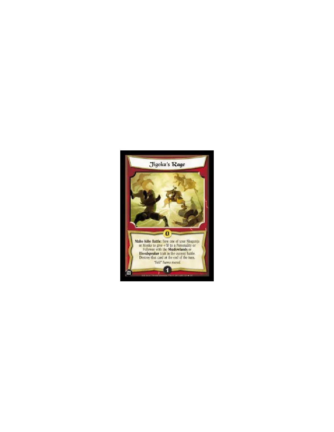 Maho Kiho Battle: Bow one of your Shugenja or Monks to give +5F to a Personality or Follower with the Shadowlands or Bloodspeaker trait in the current battle. Destroy that card at the end of the turn.
