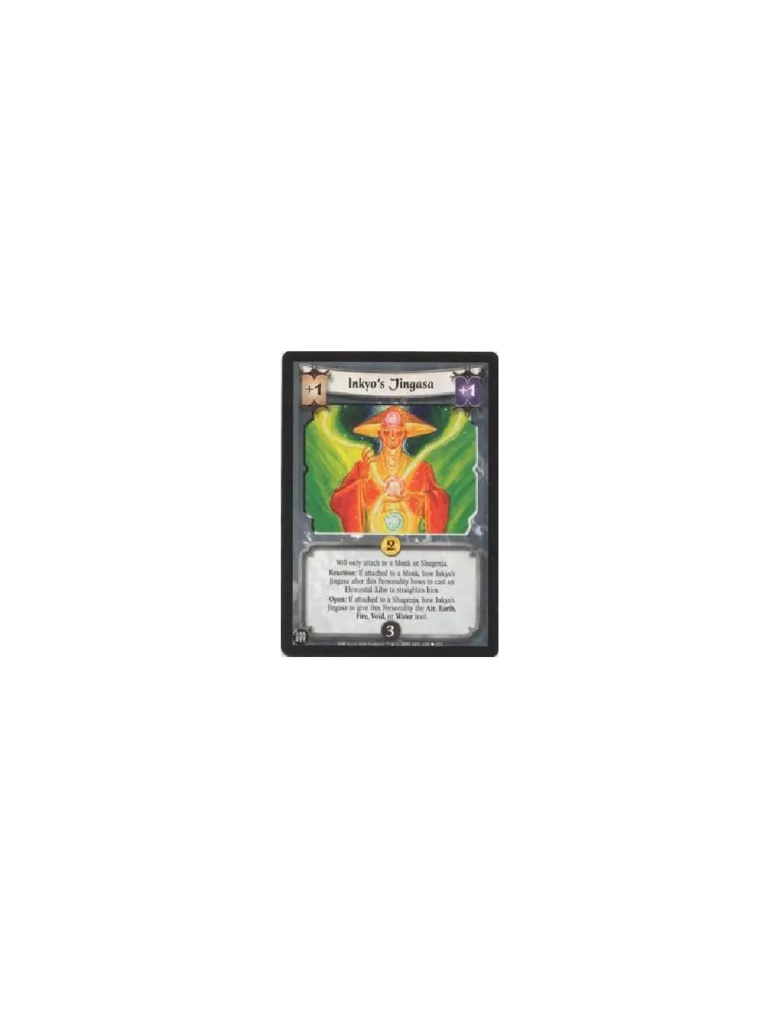 Will only attach to a Monk or Shugenja.Reaction: If attached to a Monk, bow Inkyo's Jingasa after this Personality bows to cast an Elemental Kiho to straighten him.Open: If attached to a Shugenja, bow Inkyo's Jingasa to give this Personality the Air, Earth, Fire, Void, or Water trait.
