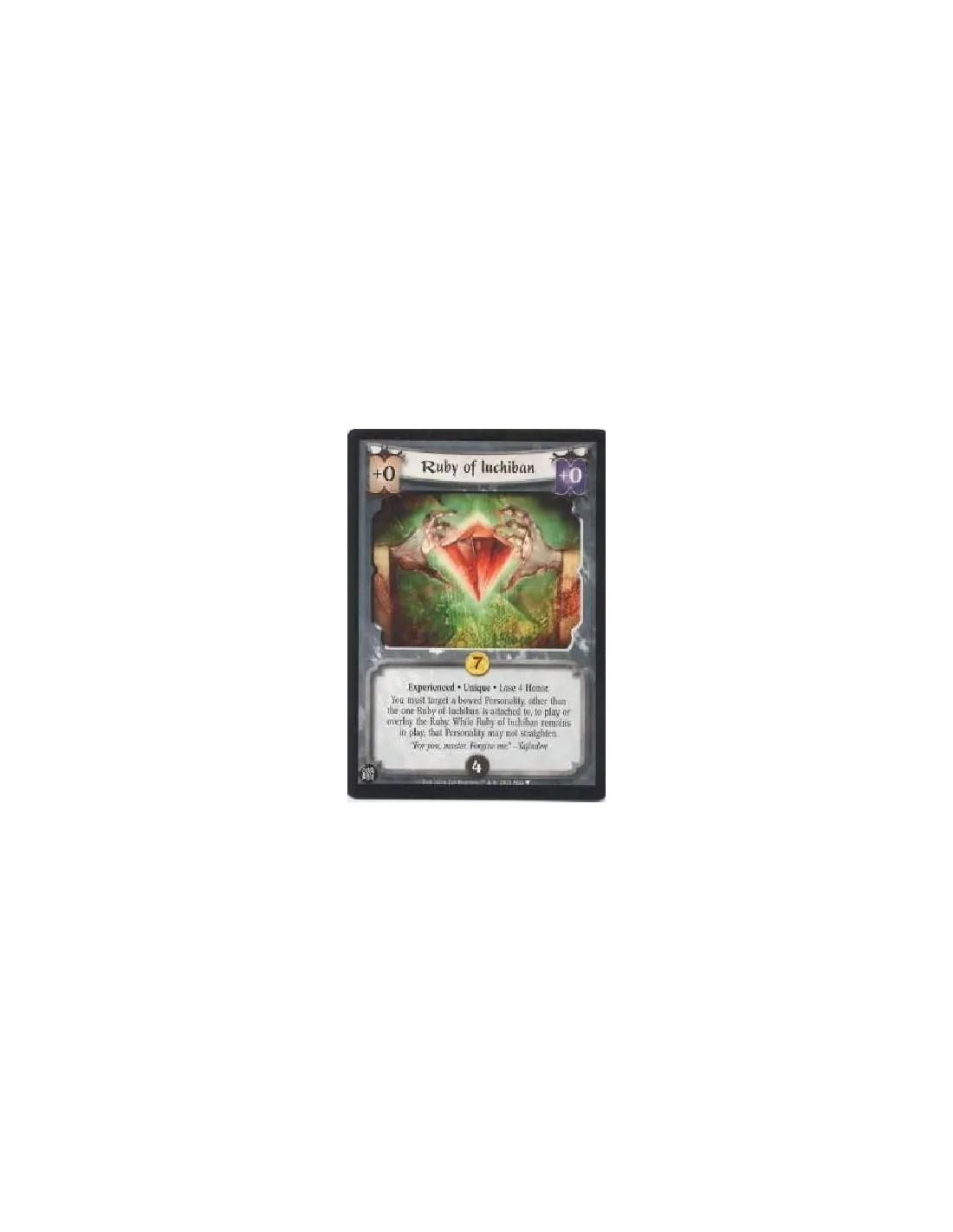 Experienced. Unique. Lose 4 Honor. You must target a bowed Personality, other than the one Ruby of Iuchiban is attached to, to play or overlay the Ruby. While Ruby of Iuchiban remains in play, that Personality may not straighten.
