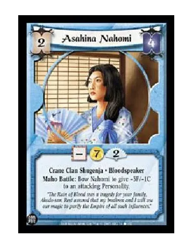 Crane Clan Shugenja. Bloodspeaker Maho Battle: Bow Nahomi to give -3F/-1C to an attacking Personality.