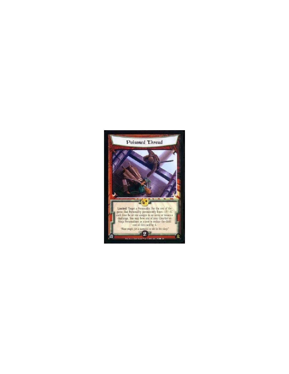 Limited: Target a Personality. For the rest of the game, that Personality permanently loses -1F/-1C each time he or she assigns to an army or issues a challenge. You may bow one of your Courtier or Ninja Personalities as a cost to reduce the Gold cost of this card by 4.