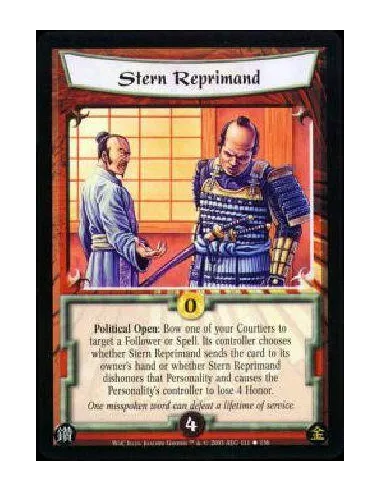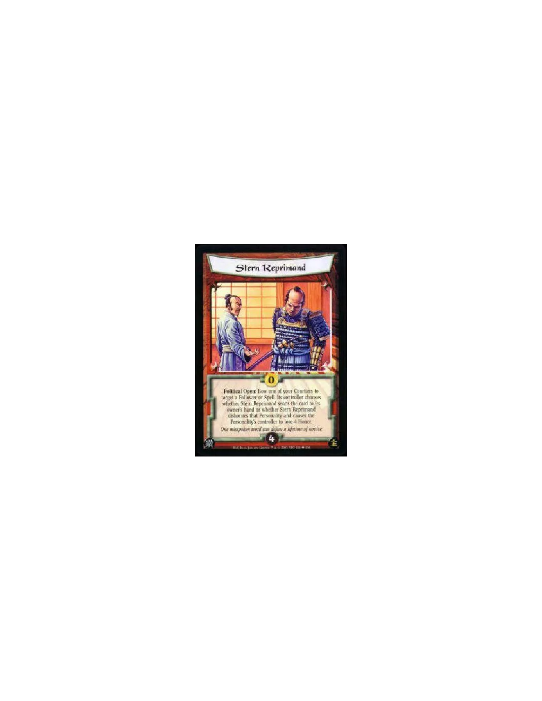 Political Open: Bow one of your Courtiers to target a Follower or Spell. Its controller chooses whether Stern Reprimand sends the card to its owner's hand or whether Stern Reprimand dishonors that Personality and causes the Personality's controller to lose 4 Honor.