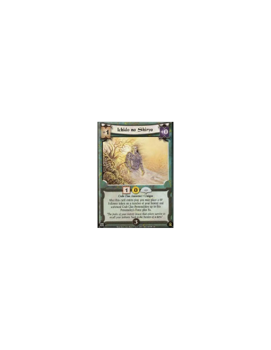 Crab Clan Ancestor * Unique After this card enters play, you may place a 0F Follower token on a number of your bowed and unbowed Crab Clan Personalities up to this Personality's Force plus Yu.