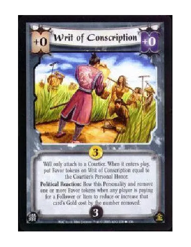 Will only attach to a Courtier. When it enters play, put Favor tokens on Writ of Conscription equal to the Courtier's Personal Honor. Political Reaction: Bow this Personality and remove one or more Favor tokens when any player is paying for a Follower or Item to reduce or increase that card's Gold cost by the number removed.