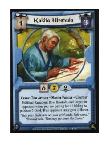 Crane Clan Artisan . Master Painter . Courtier Political Reaction: Bow Hirotada and target an opponent when you are paying for a Holding to produce 3 Gold. That opponent may gain 1 Honor.