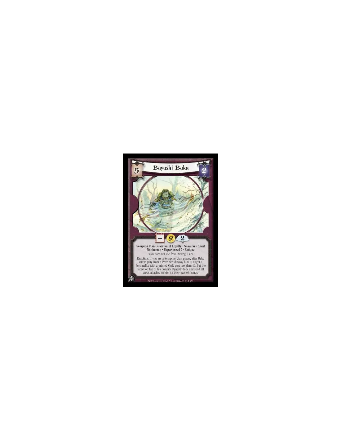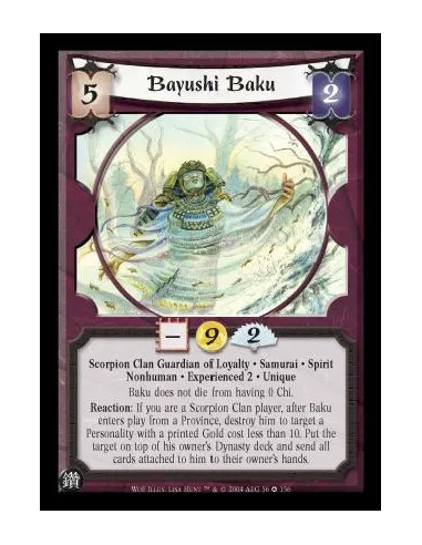 Scorpion Clan Guardian of Loyalty. Samurai. Spirit. Nonhuman. Experienced 2. Unique Baku does not die from having 0 Chi. Reaction: If you are a Scorpion Clan player, after Baku enters play from a Province, destroy him to target a Personality with a printe