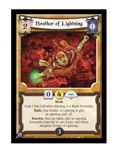 Monk Costs 1 less Gold when attaching to a Monk Personality. Battle: Bow Brother of Lightning to give an opposing card -2F. Reaction: Once per battle, after an opposing Personality bows due to one of your card effects, straighten Brother of Lightning.
