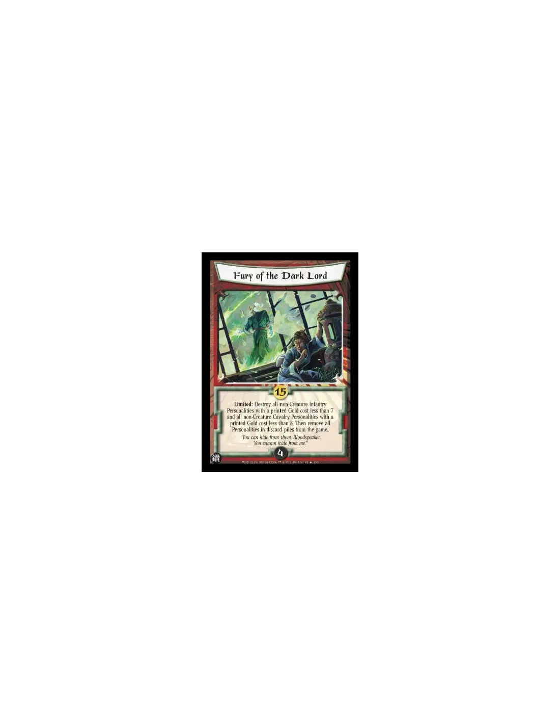 Limited: Destroy all non-Creature Infantry Personalities with a printed Gold cost less than 7 and all non-Creature Cavalry Personalities with a printed gold cost less than 8. Then remove all Personalities in discard piles from the game.
