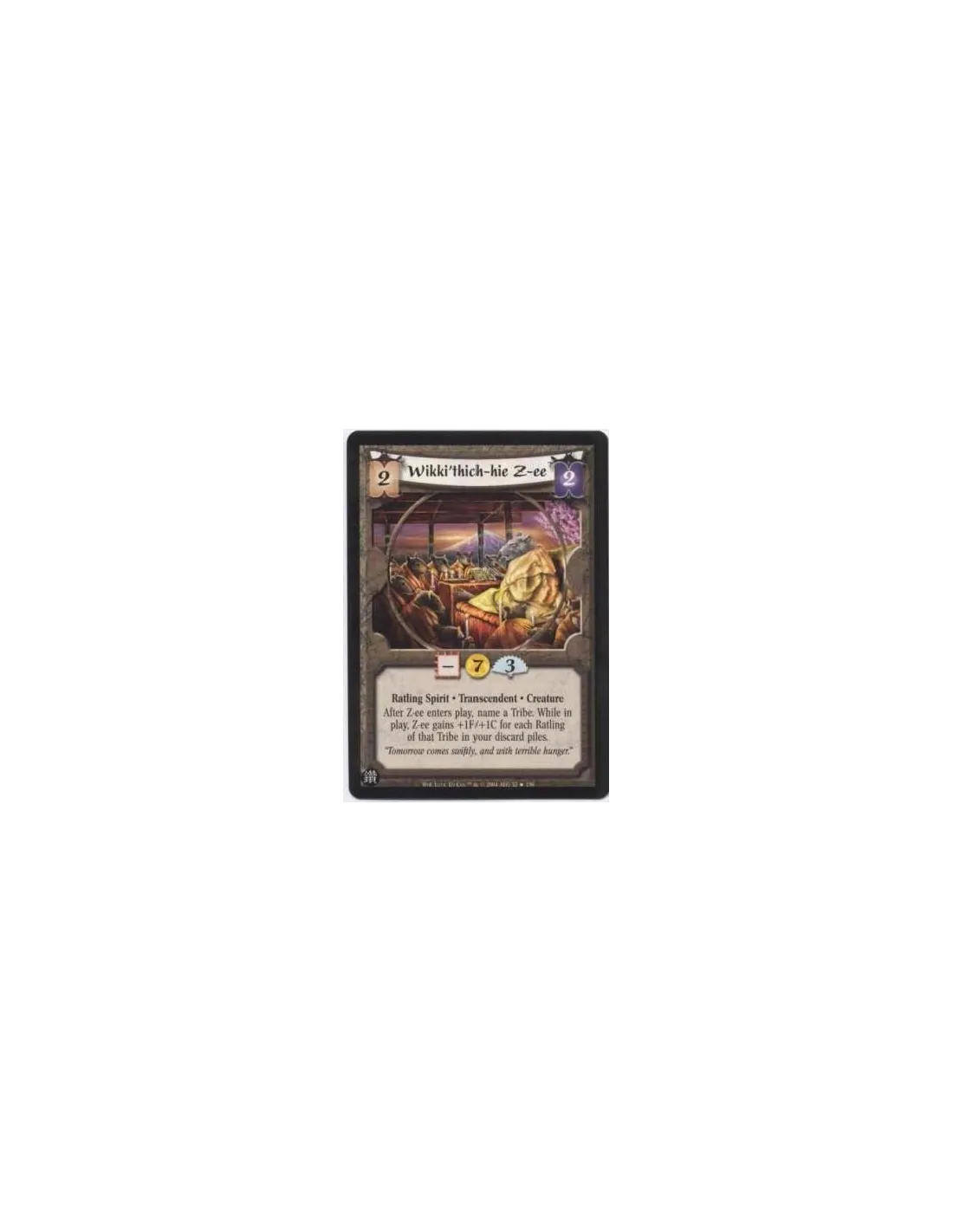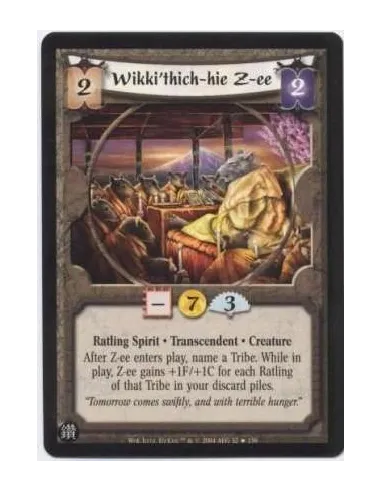 Ratling Spirit. Transcendent. Creature After Z-ee enters play, name a Tribe. While in play, Z-ee gains +1F/+1C for each Ratling of that Tribe in your discard piles.