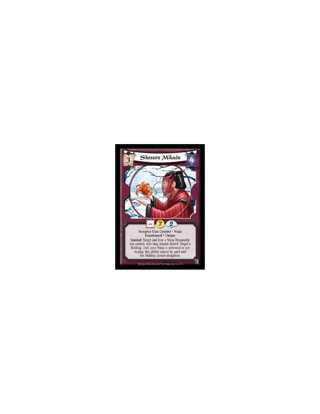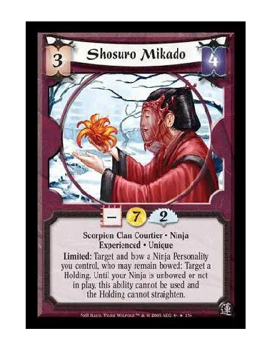 Scorpion Clan Courtier · Ninja · Experienced · Unique. Limited: Target and bow a Ninja Personality you control, who may remain bowed: Target a Holding. Until your Ninja is unbowed or not in play, this ability cannot be used and the Holding cannot straighten