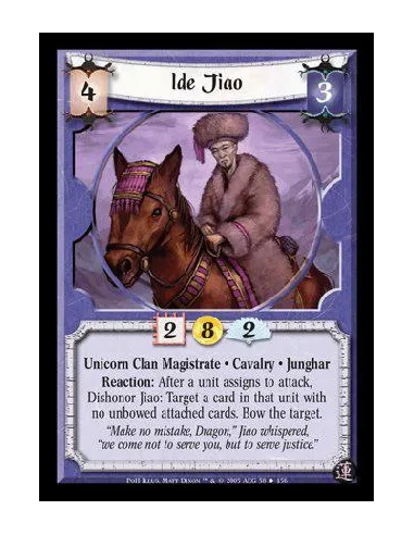 Unicorn Clan Magistrate · Cavalry · Junghar. Reaction: After a unit assigns to attack, Dishonor Jiao: Target a card in that unit with no unbowed attached cards. Bow the target