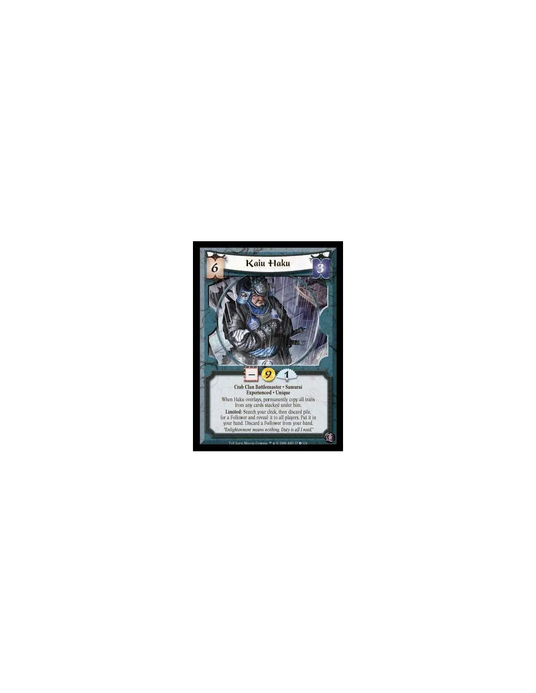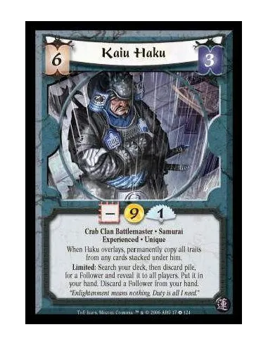 Crab Clan Battlemaster · Samurai · Experienced · Unique. When Haku overlays, permanently copy all traits from cards stacked under him. Limited: Search your deck, then discard pile, for a Follower and reveal it to all players. Put it in your hand. Discard a Follower from your hand.