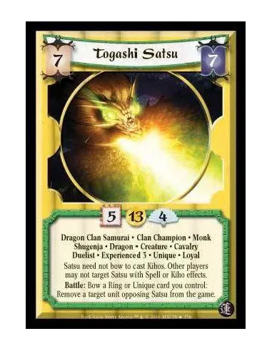 Dragon Clan Samurai · Clan Champion · Monk · Shugenja · Dragon · Creature · Cavalry · Duelist · Experienced 3 · Unique · Loyal. Satsu need not bow to cast Kihos. Other players may not target Satsu with Spell or Kiho effects. Battle: Bow a Ring or Unique card you control: Remove a target unit opposing Satsu from the game.