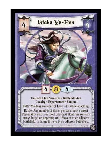Unicorn Clan · Samurai · Battle Maiden · Cavalry · Experienced · Unique. Your Battle Maidens have +1F while attacking. Battle: Any number of times per turn, bow a target Personality with 3 or more Personal Honor in Yu-Pan's army: Target a unit opposing Yu-Pan. Move it to an adjacent province, or home if there is no adjacent province.