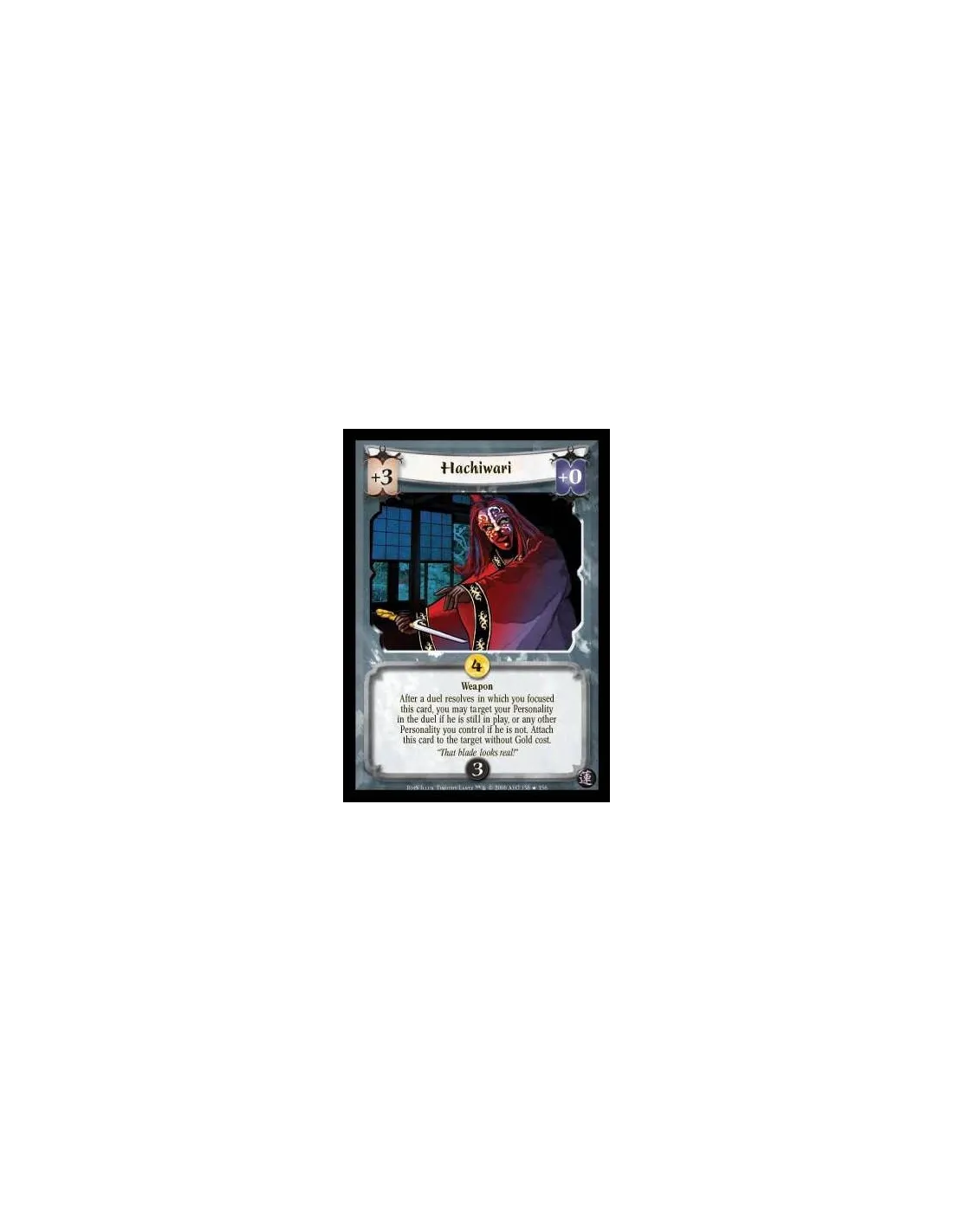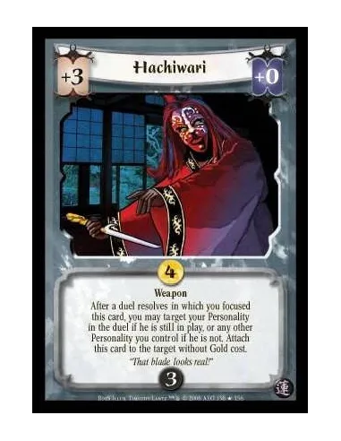 Weapon. Focus Effect: After this duel resolves, you may target your Personality in the duel if he is still in play, or any other of your Personalities if he is not. Attach this card to the target, waiving its Gold Cost.