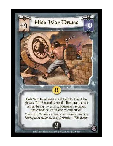 Hida War Drums costs 2 less Gold for Crab Clan players. This Personality has the Hero trait, cannot assign during the Cavalry Maneuvers Segment, and cannot be sent home by card effects.