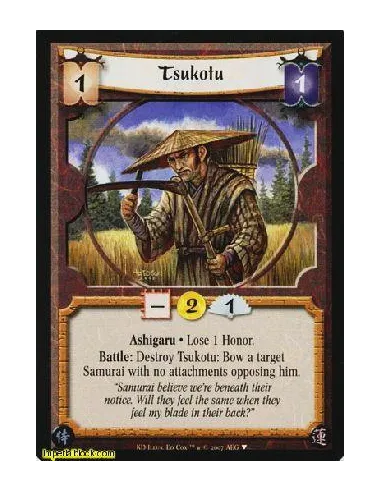 Ashigaru • Loose 1 Honor. Battle: Destroy Tsukotu: Bow a target Samurai with no attachments opposing him.
