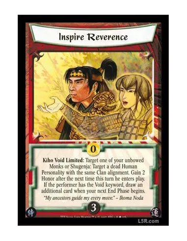 Kiho Void Limited: Target one of your unbowed Monks or Shugenja: Target a dead Human Personality with the same Clan alignment. Gain 2 Honor after the next time this turn he enters play. If the performer has the Void keyword, draw an additional card when your next End Phase begins.