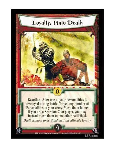 Reaction: After one of your Personalities is destroyed during battle: Target any number of Personalities in your army. Move them home; if you are a Scorpion Clan player, you may instead move them to one other battlefield
