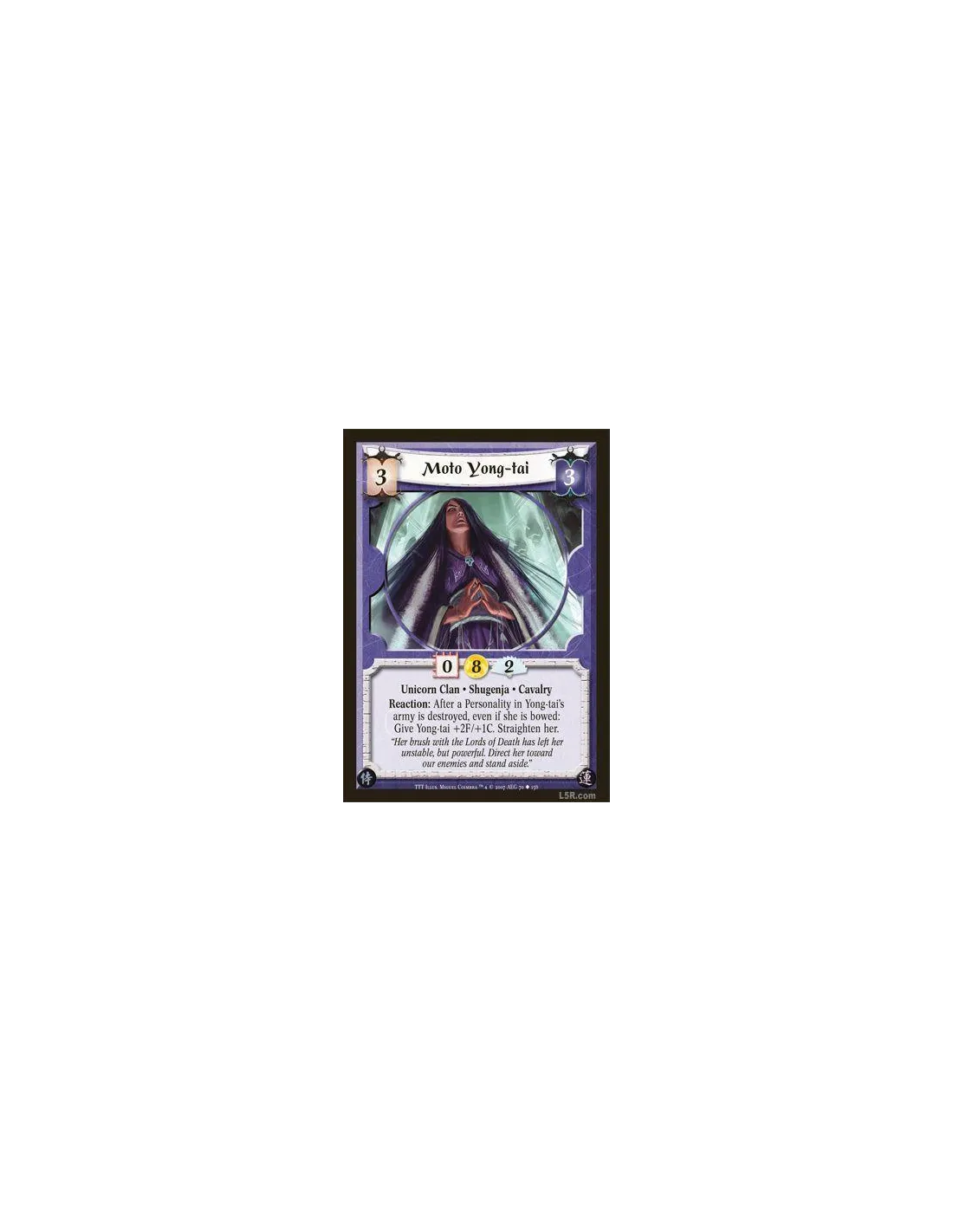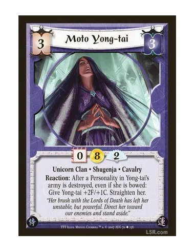 Unicorn Clan · Shugenja · Cavalry. Reaction: After a Personality in Yong-tai's army is destroyed, even if she is bowed: Give Yong-tai +2F/+1C. Straighten her.