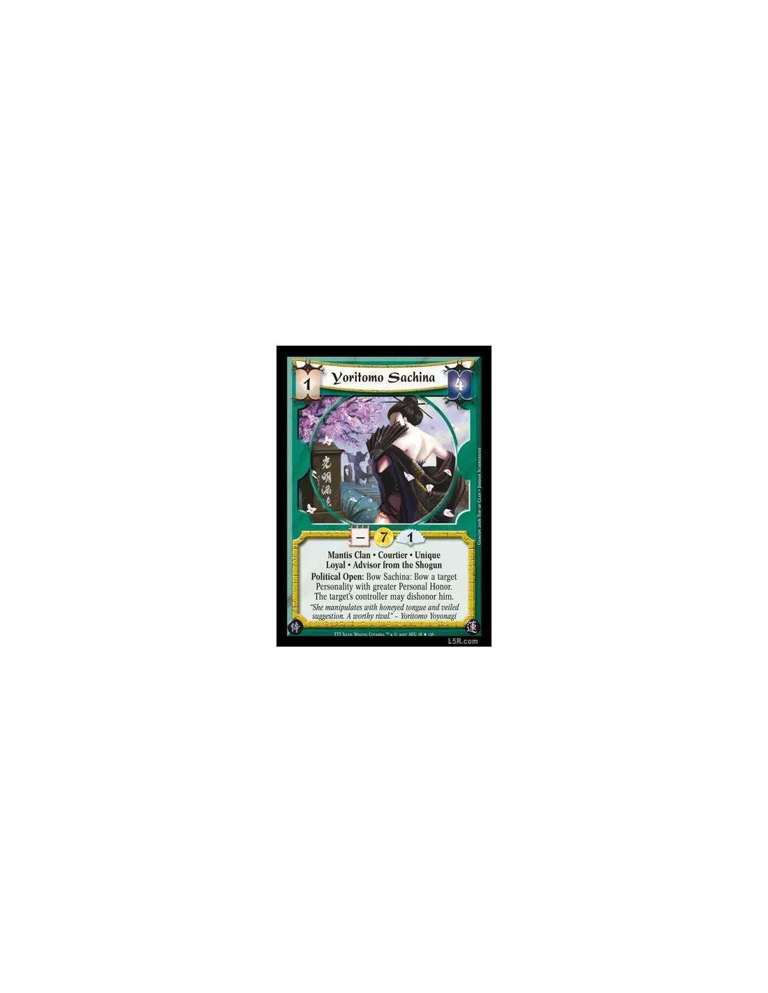 Mantis Clan · Courtier · Unique · Loyal · Advisor from the Shogun. Political Open: Bow Sachina: Bow a target Personality with greater Personal Honor. The target's controller may dishonor him