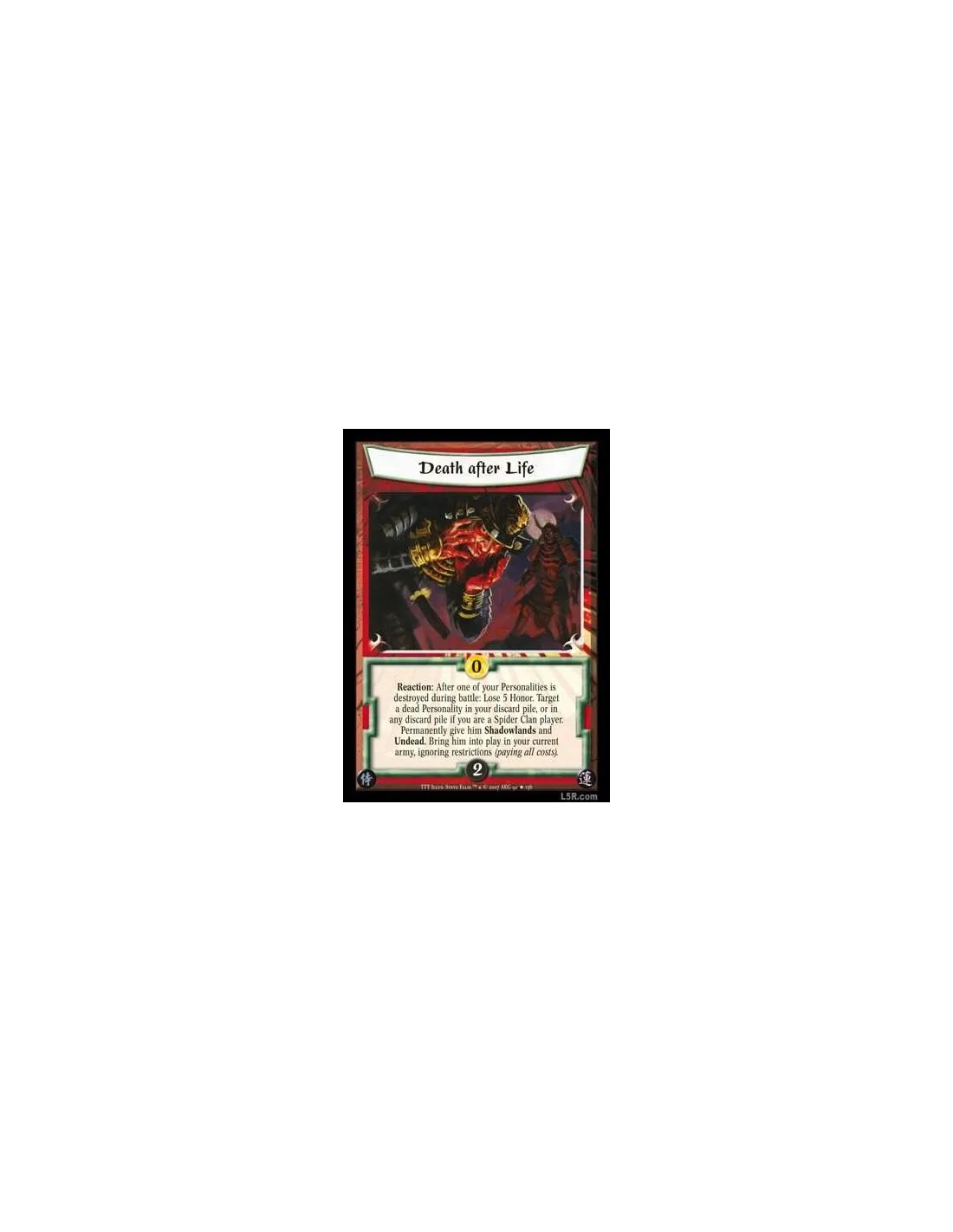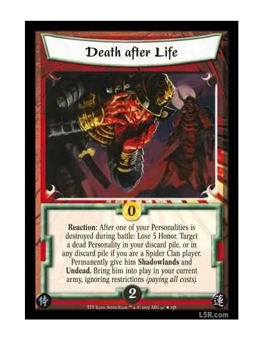 Reaction: After one of your Personalities is destroyed during battle: Lose 5 Honor. Target a dead Personality in your discard pile, or in any discard pile if you are a Spider Clan player. Permanently give him Shadowlands and Undead. Bring him into play in your current army, ignoring restrictions (paying all costs).
