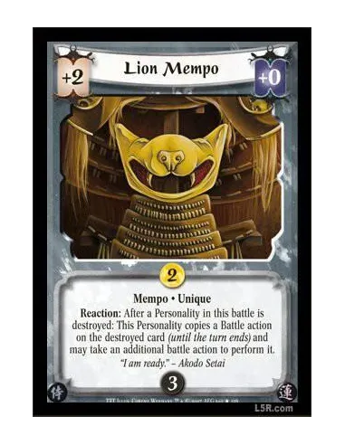 Mempo · Unique. Reaction: After a Personality in this battle is destroyed: This Personality copies a Battle action on the destroyed card (until the turn ends) and may take an additional battle action to perform it.