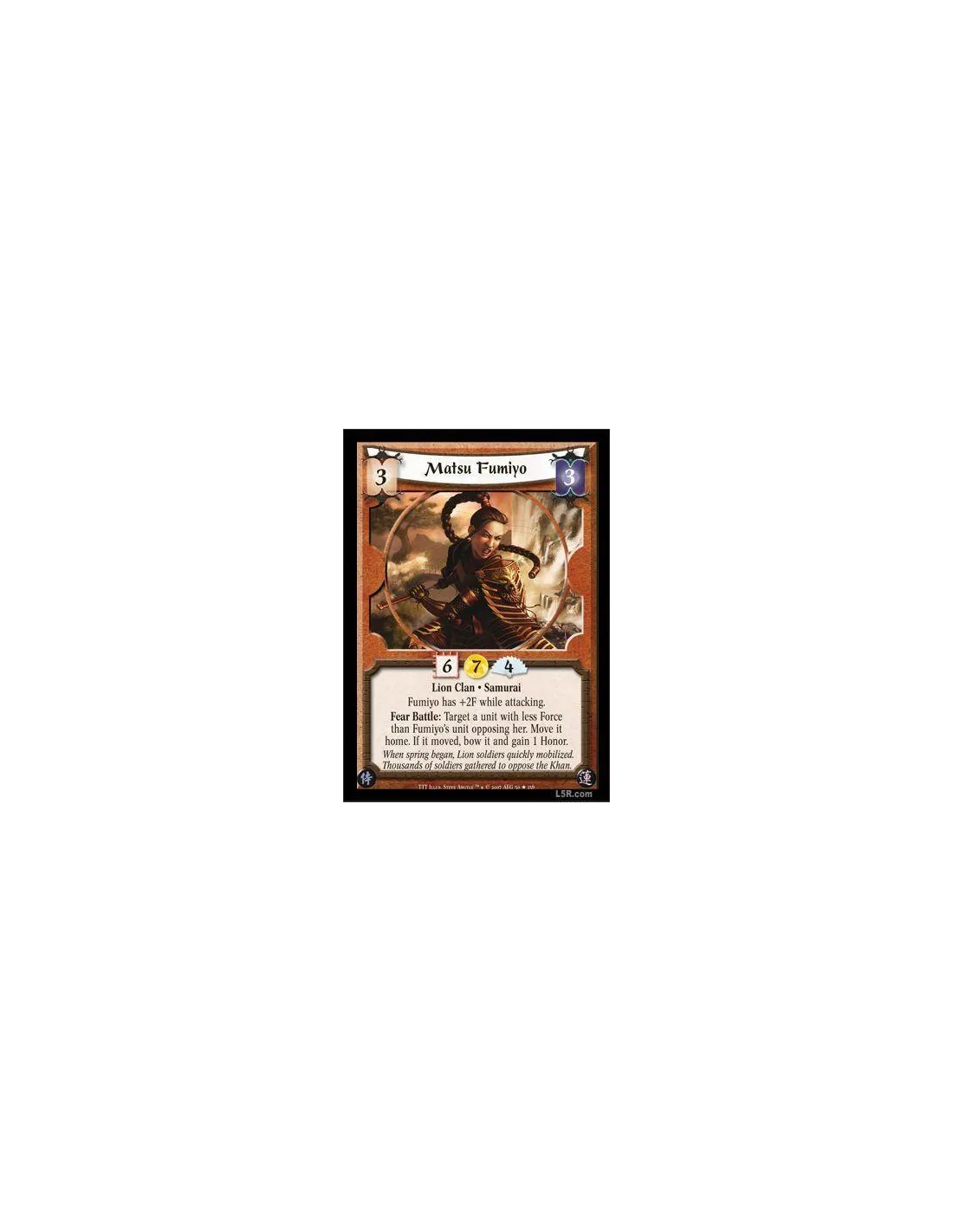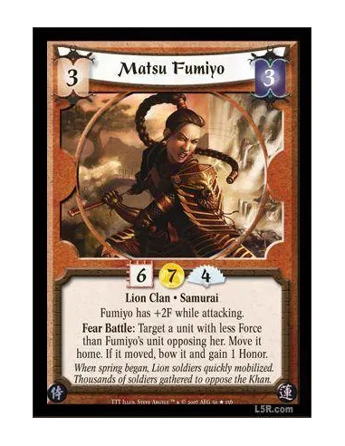 Lion Clan · Samurai. Fumiyo has +2F while attacking. Fear Battle: Target a unit with less Force than Fumiyo's unit opposing her. Move it home. If it moved, bow it and gain 1 Honor