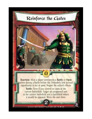 Reaction: After a player announces a Battle or Open action during a battle before the Defender's first normal opportunity to act or pass: Negate the action's effects. Battle: Even if you control no units at the current battlefield: Target an unopposed unit at the current battlefield and a battlefield where it would be opposed. Move the unit there
