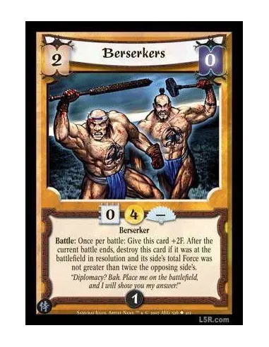 Berserker Battle : Once per battle: Give this card +2F. After the current battle ends, destroy this card if it was at the battlefield in resolution and its side's total Force was not greater than twice the opposing side's.